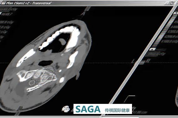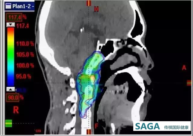常规分割治疗40CGE后,予24CGE/6F/90%/qd。质子治疗剂量分布图像: