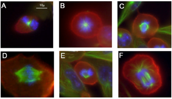 免疫组织染色 经过电场处理后的细胞的异常“有丝分裂”图像 微管(绿色)、肌动蛋白(红色)、DNA(蓝色)