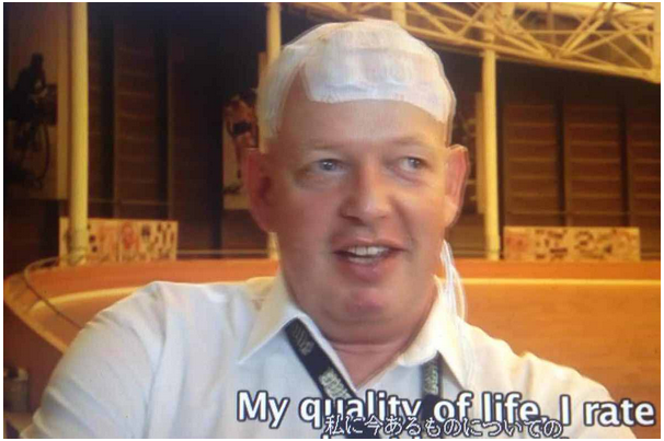 图为:戴着治疗帽的罗伯特正在评价“电场疗法”治疗中的体验和QOL(生活品质)。他感谢医师、感谢给他带来生命希望的宝贵的每一天。