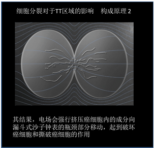 电场疗法的原理:细胞程度2 在纺锤体形成后的癌细胞内,开始了从1个细胞变为2个细胞的细胞分裂。 分裂时,癌细胞的形状类似漏斗式沙子钟表,在外界电场的作用下,电场的分布会不很均一。 其结果,电场会强行挤压癌细胞内的成分向漏斗式沙子钟表的瓶颈部分移动,起到破坏癌细胞和撕破癌细胞的作用。 分裂后期:细胞内的高分子、小器官等成分向瓶颈移动→破坏癌细胞