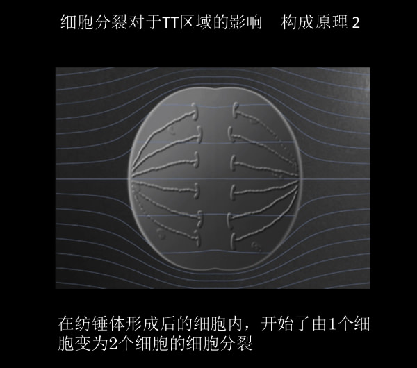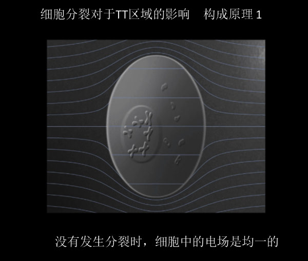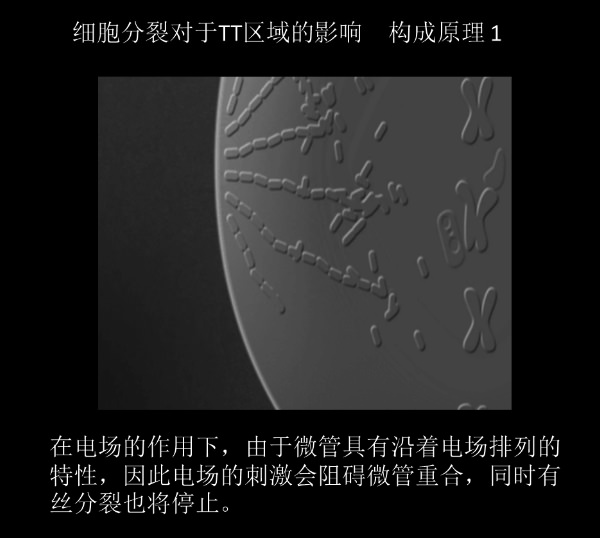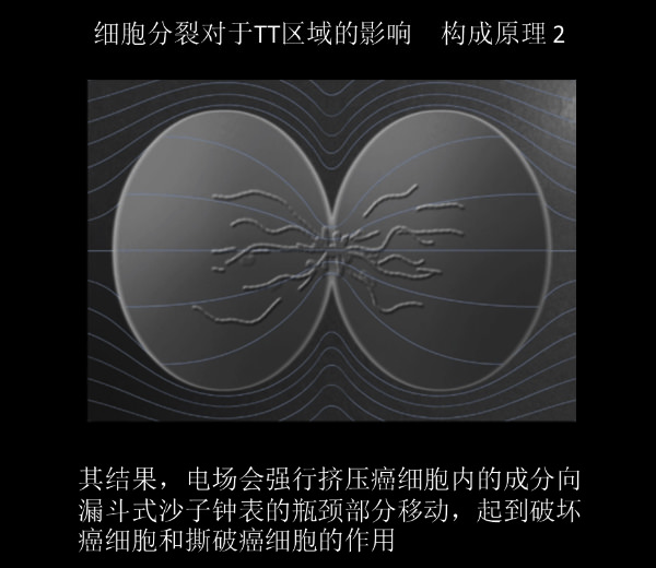 电场疗法的原理: 细胞程度 2 在纺锤体形成后的癌细胞内,开始了从1个细胞变为2个细胞的细胞分裂。 分裂时,癌细胞的形状类似漏斗式沙子钟表,在外界电场的作用下,电场的分布会不很均一。 其结果,电场会强行挤压癌细胞内的成分向漏斗式沙子钟表的瓶颈部分移动,起到破坏癌细胞和撕破癌细胞的作用。 分裂后期: 细胞内的高分子、小器官等成分向瓶颈移动→破坏癌细胞