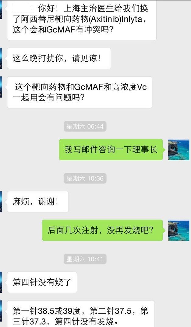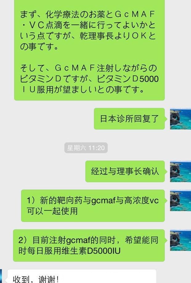 9月6日10:00 M先生及家属,医疗翻译经护士引导,进入诊疗室,乾理事长拿着日本医疗服务机构事前提交的诊疗情况提供书,病例资料,血检报告等,与M先生进行了详细问询,并让他躺在治疗床上,进行听诊触诊,及一些检查。 乾理事长检查后,告诉M先生,他目前身体很虚弱,但是不建议完全停止服用靶向药,目前虽然索坦的副作用太大而不得不停用,依然建议改其他靶向药,在此基础上结合GcMAF的免疫治疗,效果才会比较理想。 另外,因检查发现M先生已经出现腹腔积液,需要尽快开始靶向药+GcMAF注射+初乳MAF口服,如果有条件的话,还可携带进口的高浓度VC针剂回国后进行静脉点滴注射,可有效抑制癌细胞增殖。 M先生感叹的说,这次在日本的治疗,最大的感受就是,日本医生面对患者的耐心,细心,以及以人为本的医者父母心。不同于国内医院哪怕等候一整天见到名医,也是3分钟被强行结束问诊的经历,这次与乾理事长的初诊问诊,持续到M先生及家属不再有疑问为止,一共进行了50多分钟的沟通交流,使M先生对于自己的病情有了更好更深的了解,特别是问到自己在饮食方面应该有哪些注意点,应该多吃哪些食物,都得到了很好的回答。 M先生因为是通过我公司预约乾理事长,所以能通过绿色就医通道在10日内取得乾理事长的首诊预约名额,而且享受到了乾理事长的一些优惠待遇,这也是让M先生感到意外和惊喜的地方。 9月6日当天,M先生接受了第一次GcMAF注射治疗,当晚9点左右开始出现发烧现象,最高38.9度,经过物理降温,后半夜开始退烧。 同时M先生反应,肿瘤部位会有疼痛感,日本医疗服务机构建议,可以考虑咨询日本医生,开一些日本止痛药,副作用小而效果理想。