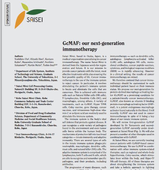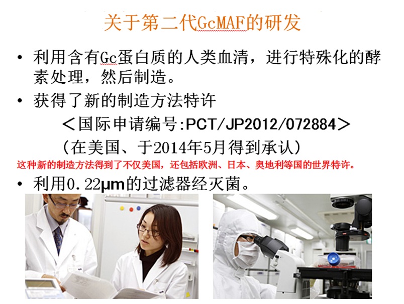 *********************************************************************************************** (GcMAF参考内容) 近年来,日本在免疫细胞治疗领域全球领先,而且日本政府卫生部门对于免疫细胞治疗的监管也在逐步放开,临床上出现了大量成功的案例。在日本,开展癌症的免疫治疗,必须通过国家的再生医疗委员会和地方的卫生局申请,经严密的考察后才能取得免疫治疗的认定资格。目前,巨噬细胞免疫疗法(Gc-MAF)已获得包括美国、日本、德国等国际专利,并在临床试验中取得显著效果。 巨噬细胞疗法是一种能最大限度地激活人体本身具备的免疫系统的疗法。而且,也可以说是同时兼备了NK细胞疗法+树状细胞疗法的治疗方法。 针对疾患 巨噬细胞活性化疗法是一种把人体内沉睡的免疫细胞(巨噬细胞)激活后的治疗方法。关于巨噬细胞的论文在诺贝尔医学奖辈出的世界最权威的科学、医学杂志Nature上刊登。