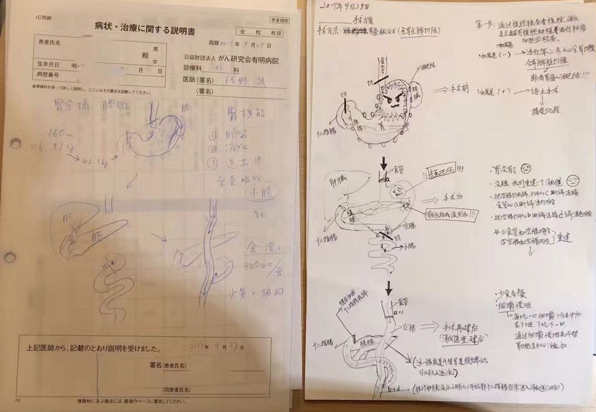 佐野武教授(世界级权威胃癌外科专家) 9月16日,患者及家属按照预定计划,抵达东京。 9月17日,在癌研有明医院接受佐野武教授的初诊问诊,并做了各项相关检查。 9月26日,患者办理入院手续,入住医院病房 9月27日,佐野武教授亲自进行术前说明,通过画图+文字的形式,详细讲解手术方案等