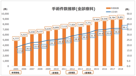 ▲癌研有明医院手术数量 该院的肺癌手术治疗历史悠久,始于1955年的第一例手术。自那时以来,治疗数量稳步积累,2016年4月的治疗数量达到5,000件。目前,该院每年治疗约730例肺癌,约380例患者接受了手术,约300例患者主要接受了化疗,约50例主要接受了放疗(立体定向放疗;精确放疗等)。 该院在食管癌治疗方面正在积极进行内窥镜手术,以减少食道癌手术的侵袭性。2019年,该院通过内窥镜手术切除的病例占所有病例的97%。另一方面,世界上没有关于胸腔镜手术是否具有与传统开胸手术相同的长期效果的数据。目前,该院正在参加一项在日本进行的比较胸腔镜手术与常规开胸手术的长期效果的临床试验(研究JCOG1409)。 在胃癌治疗方面,该院将“避免全胃切除术”作为主要目标之一,以提高患者的预后。根据日本胃癌学会2007年的国家统计,全胃切除术约占全部胃切除术的30%,但该院在2015年进行了全胃切除术约为15% ,这个数据证明在该院治疗胃癌可以获得更好的预后。2019年,该院行胃部手术659例,其中原发胃癌切除术468例,达芬奇机器人手术55例。 在结直肠癌治疗方面,该院每年进行700例或更多的结直肠癌手术病例,腹腔镜手术约占97%以上,预后效果好,住院时间短;早期大肠癌和大肠息肉的内镜治疗每年超过2900次,结肠镜检查每年超过8700次; 晚期癌症的门诊静脉化疗约每月500例。 不仅是直肠癌,结肠癌的“机器人手术”也适用于保险 达芬奇机器人手术可以弥补开腹手术和腹腔镜手术的缺点,期待能够进行精密的手术进行调试。2018年“直肠切除·切断术”,2022年“结肠恶性肿瘤手术”适用于保险,所有大肠癌患者的保险适用扩大进行调试。在本院2022年9月开始机器人4台体制正在进行手术。 机器人手术的方法 在被称为佩辛手推车的机器人主体上安装微型摄影头和钳子,从8mm的小伤口将它们插入腹部进行手术。医生坐在控制台上,通过远程操作移动机器人主体。 机器人手术的特点 3D的全高清图像放大约10倍的照相机(腹腔镜)通过使用,手术部位的详细解剖也变得容易理解了。 机器人钳子比人的手更好地弯曲(多关节功能),不抖动的钳子来修改标记元素的显示属性精准细致的手术来修改标记元素的显示属性。 机器人手术的历史 1990年代在美国被开发,2009年在日本被承认为药事。到2021年12月,日本引进了约500台,世界上引进了约6500台达芬奇。另外,在日本到2021年12月为止对于直肠癌,估计有15000名以上的患者接受了达芬奇机器人手术。 诊疗实绩 从2018年5月到2022年9月487名患者在我院接受达芬奇机器人辅助下结肠或直肠手术。