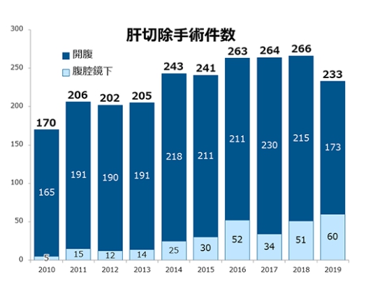 ▲肝切除开腹手术和微创手术数量对比