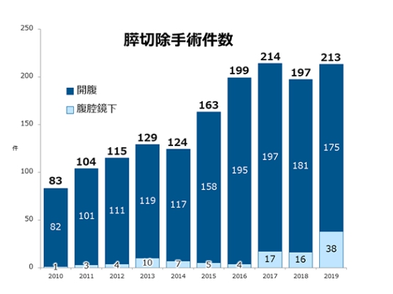癌研有明医院的肝胆和胰腺外科将通过与其他部门进行跨机构、跨学科的紧密合作,从而为所有患者提供医疗服务。在该科室,除了传统的扩张手术旨在针对高度晚期癌症的彻底血管重建术以及其他器官的血管重建术和切除术外,近年来,医务人员还积极采用微创手术(腹腔镜手术)来扩大手术数量。目前,该科室的手术数量已超过600例。