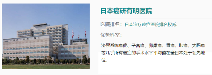 ![]() 癌研有明医院,全称癌症研究会有明医院,位于日本东京,始建于1908年,是日本排名第一的癌症治疗中心,全球排名第二,仅次于美国安德森癌症中心。
